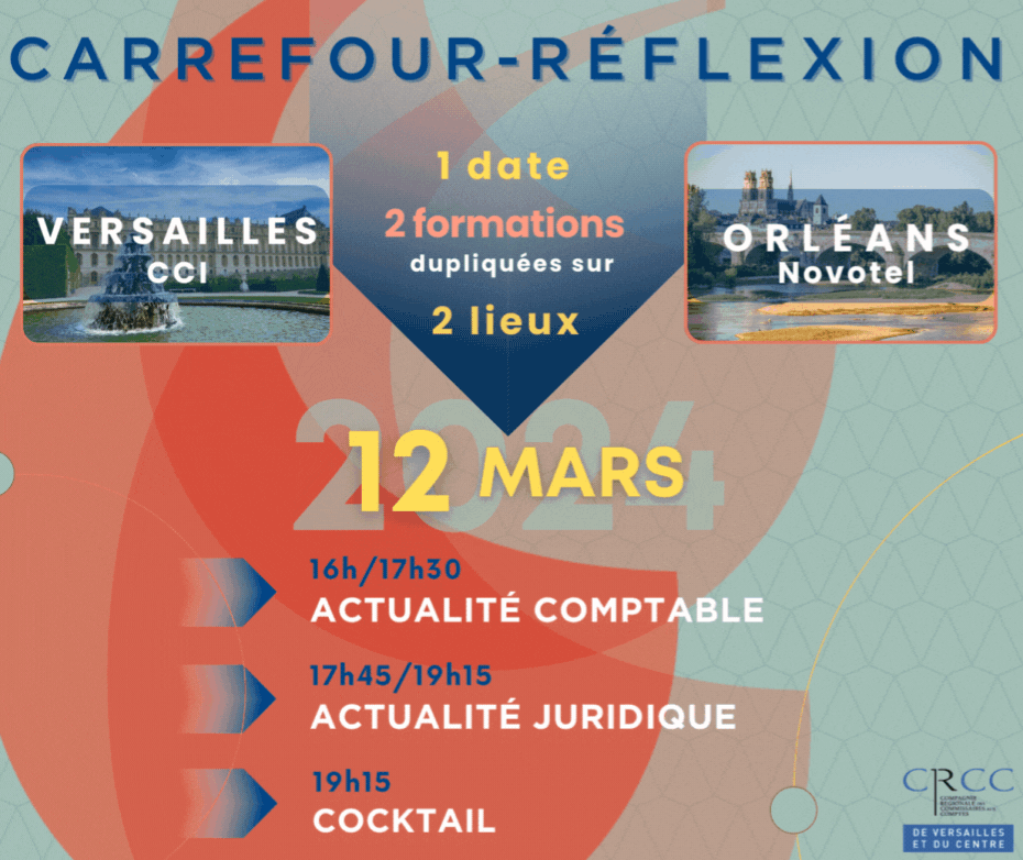Notre prochain Carrefour-Réfléxion sur « l’Actualité Comptable » et « l’Actualité Juridique » se tiendra le 12 mars prochain de 16h à 19h15 à la CCI de Versailles et au Novotel Orléans.