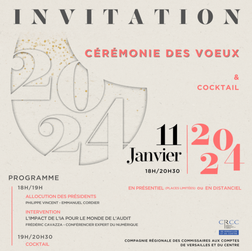 La cérémonie des voeux 2024 de la compagnie régionale des commissaires aux comptes de Versailles et du Centre se tiendra en phygital le 11 janvier prochain.